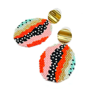 These whimsical and wavy multicolored earrings are made from tiny Miyuki Japanese glass beads handwoven together. The double brick stitch used in this pair gives a unique textured effect which matches perfectly with the organic flowing colors combined in the earring. The beaded portion is hung from a gold-plated circular finding.