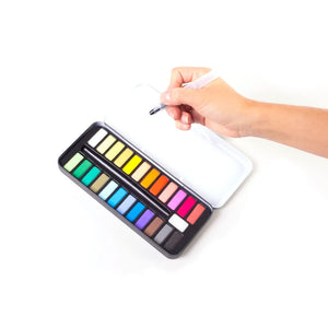 Introduce yourself to the world of watercolor painting with this accessible and portable kit. Simply fill the brush compartment with water, press gently until a drop emerges, and you're ready to create. The intuitive design makes it easy for beginners to get started right away. Perfect for exploring your artistic potential on paper, cardboard, or canvas wherever inspiration strikes.