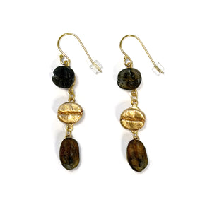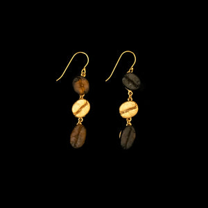 This trio of beans creates a gently cascading silhouette, with an artful mis of brown glass and 24k gold-plated bronze. The arrangement enhances the organic feel of each piece, giving a sense of movement and lightness. Elegant yet playful, these earrings echo the warm tones of roasted coffee in a form that catches both light and attention