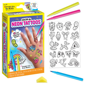 Express yourself with vibrant neon colors! This creative tattoo kit lets kids personalize 18 playful designs—from unicorns and narwhals to tacos and strawberries—using three bright brush-tip markers in pink, yellow, and blue. Perfect for ages 6 and up, it's a fun way to showcase individual style through wearable art.