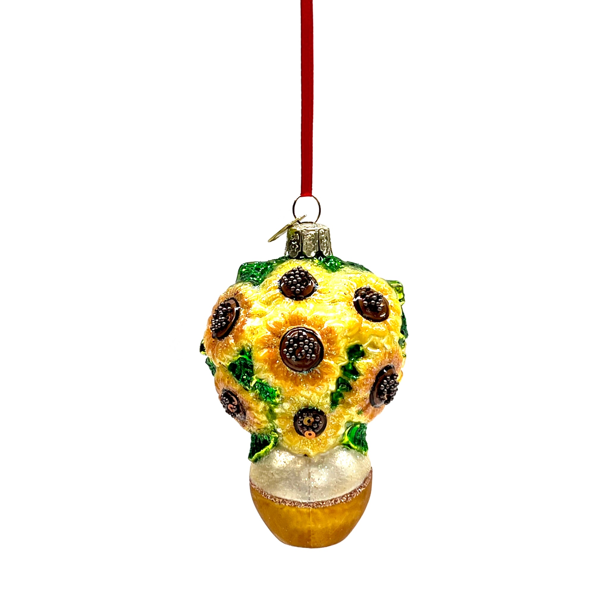 Add a touch of sunshine to your holiday decor with this charming Glass Sunflowers In Vase Ornament. Featuring bright, detailed sunflowers in a delicate glass vase, it catches the light to brighten your tree or seasonal display. Perfect for nature lovers, it brings warmth and a cheerful glow to your celebrations.