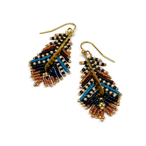 These truly unique earrings are skillfully crafted with premium Japanese Miyuki glass beads which are handwoven to create a delicate feather form. Speckled with gold beads and adorned with a brass charm, these earrings are perfect to use every day or for a special occasion. They are extremely lightweight and comfortable to wear. The earrings are hung from gold-plated ear wires fitted with a silicone backing for security.