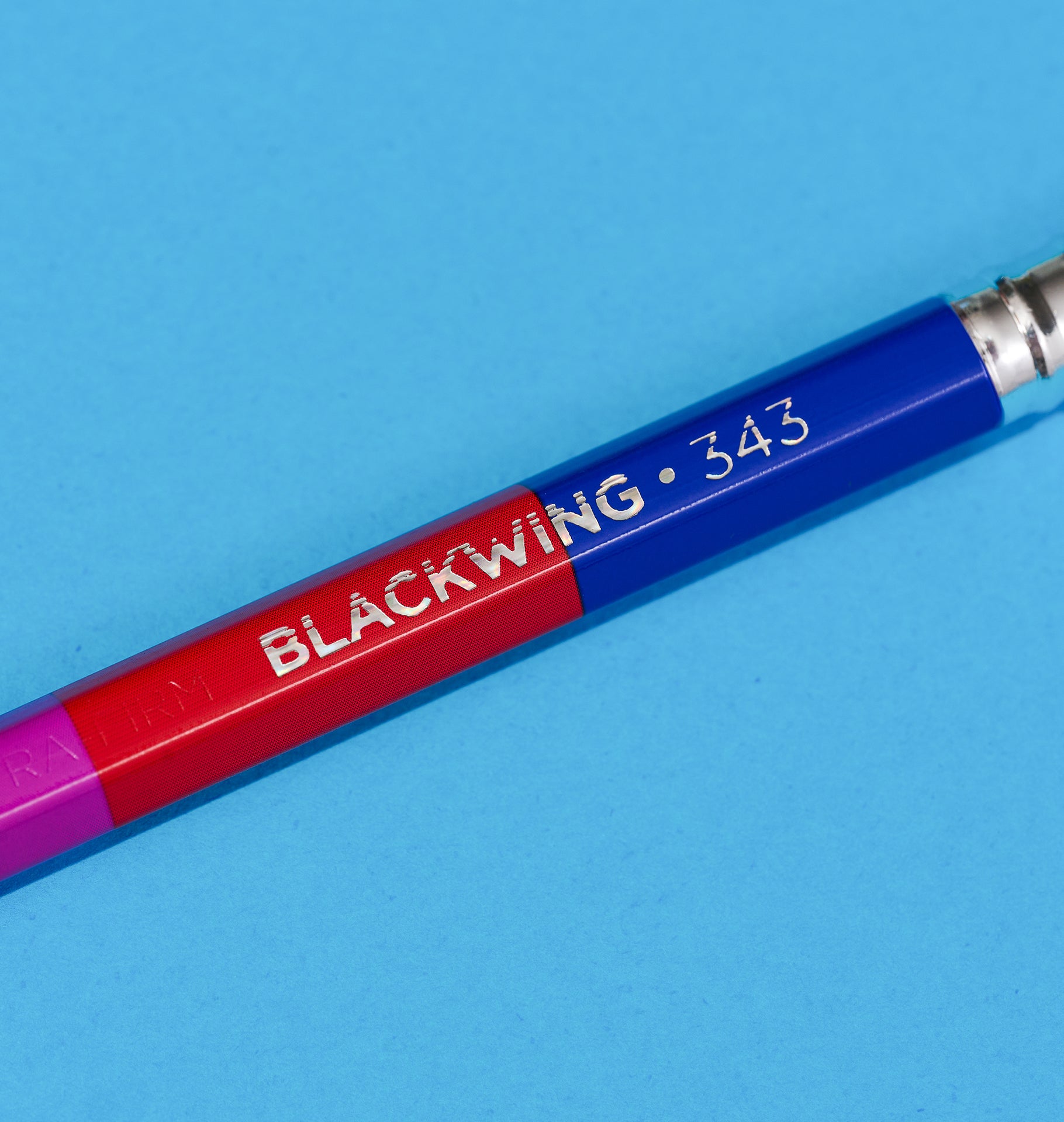 The Blackwing 343 is our tribute to broadcast television. Each pencil features a color bar finish inspired by the NTSC test pattern, and our extra-firm graphite. The model number 343, a reference to the 343 scanlines on early CRT televisions, is imprinted with a “TV snow” silver holographic foil.