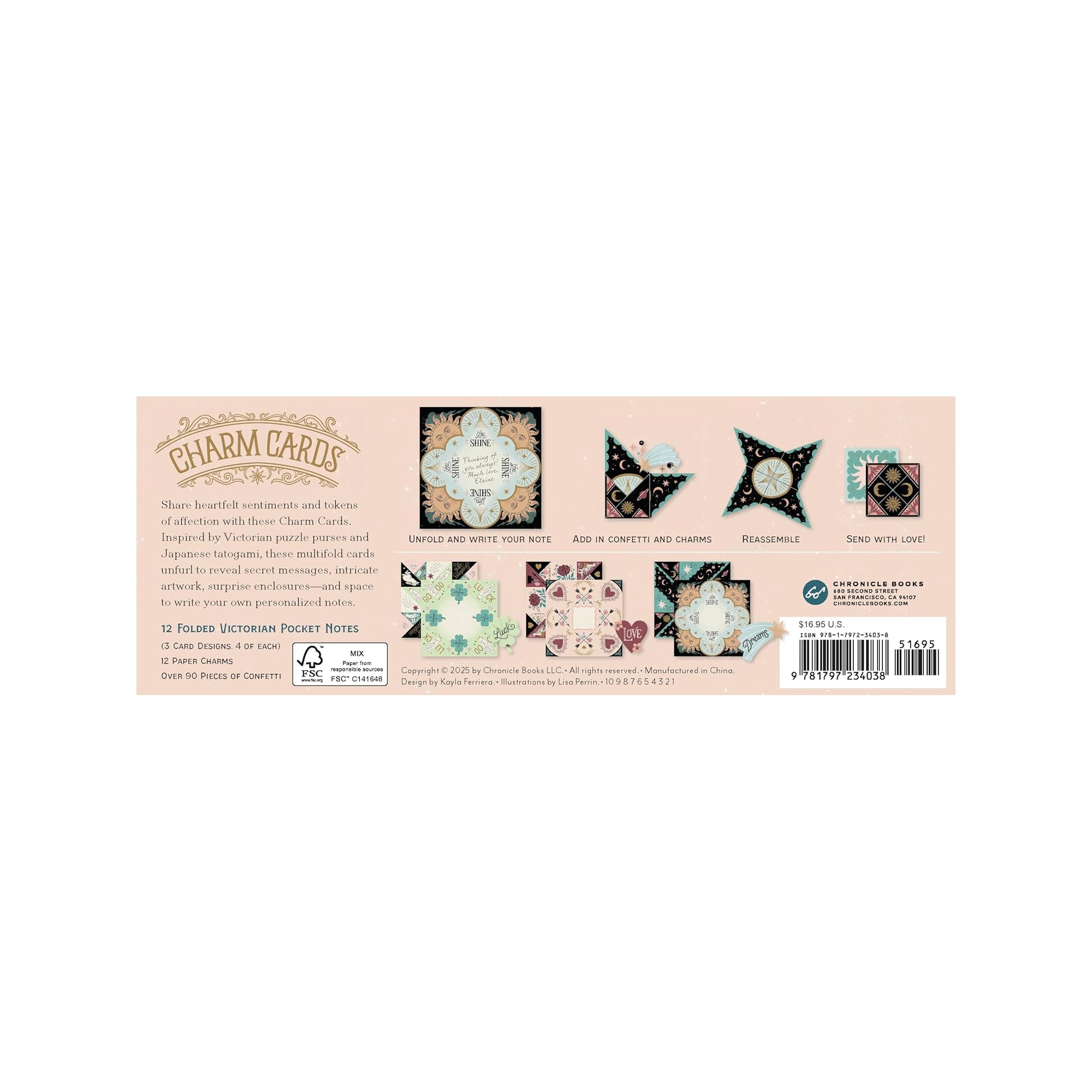 Inspired by Victorian love letters, these elegant folded Luck, Love & Dreams Charm Cards are perfect for sharing thoughtful greetings, Valentines, congratulations, and warm wishes. The set includes twelve cards—four of each of three unique designs—created by illustrator Lisa Perrin, along with matching illustrated charms. Each card folds neatly into a small pocket or purse, ideal for enclosing a charm or a little keepsake, such as a pressed flower or meaningful sticker, to express your heartfelt sentiments.
