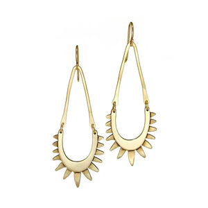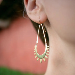 The Luz Earrings feature a radiant arc shape gracefully suspended from a textured hammered wire, creating a beautiful interplay of light and form. Crafted from brass, these earrings measure 7/8 inch wide by 2 3/8 inches high, offering a delicate yet eye-catching silhouette. They hang from 14K gold fill ear wires, ensuring a comfortable fit while adding a touch of refined elegance. Perfect for elevating both casual and formal outfits, these earrings bring a subtle sparkle to your everyday style.