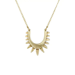 The Luz Necklace showcases a radiant arc-shaped pendant crafted from brass, offering a modern yet timeless design. The pendant measures 7/8 inch wide by 1 inch high, making it a subtle yet striking addition to any jewelry collection. Suspended from an 18-inch 14K gold fill chain, this necklace provides both durability and a delicate finish for comfortable everyday wear. Its understated elegance makes it perfect for layering with other pieces or worn alone to add a touch of refined beauty to any outfit.