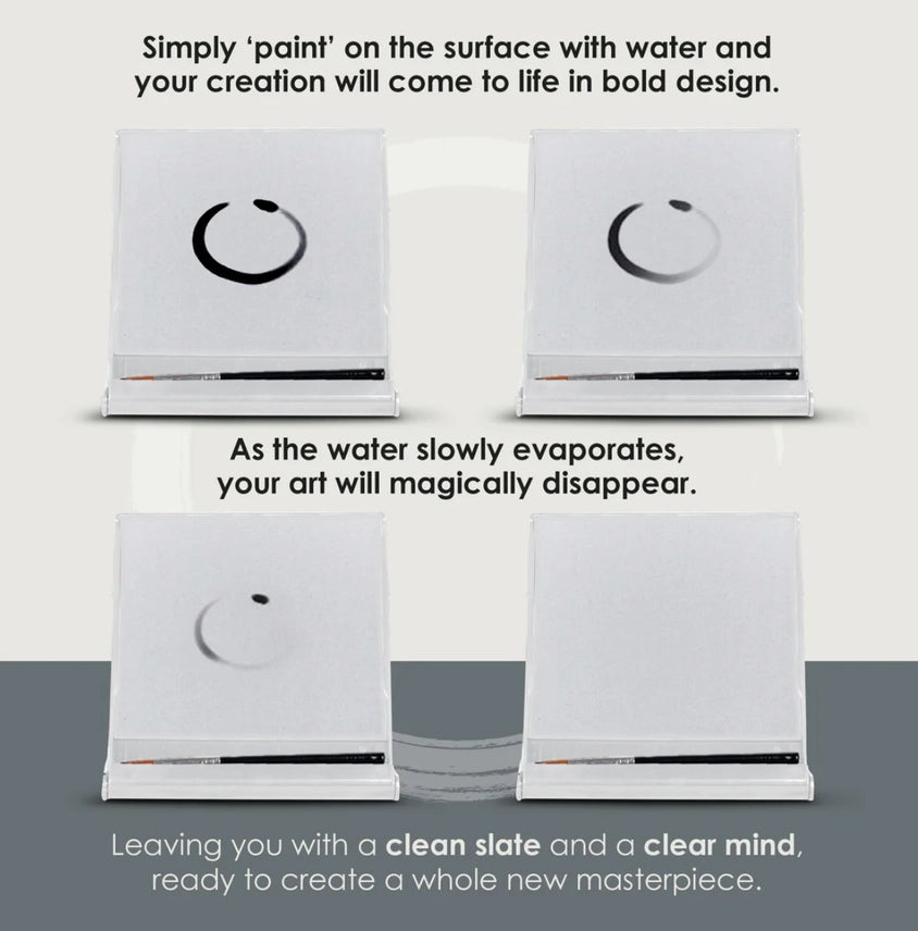 Inspiré du concept zen de vivre l'instant présent, peignez simplement la surface avec de l'eau et votre création prendra vie avec un design audacieux. Puis, à mesure que l'eau s'évapore, votre œuvre disparaîtra comme par magie, vous laissant avec une page blanche et l'esprit clair, prêt à créer un nouveau chef-d'œuvre.