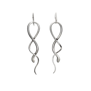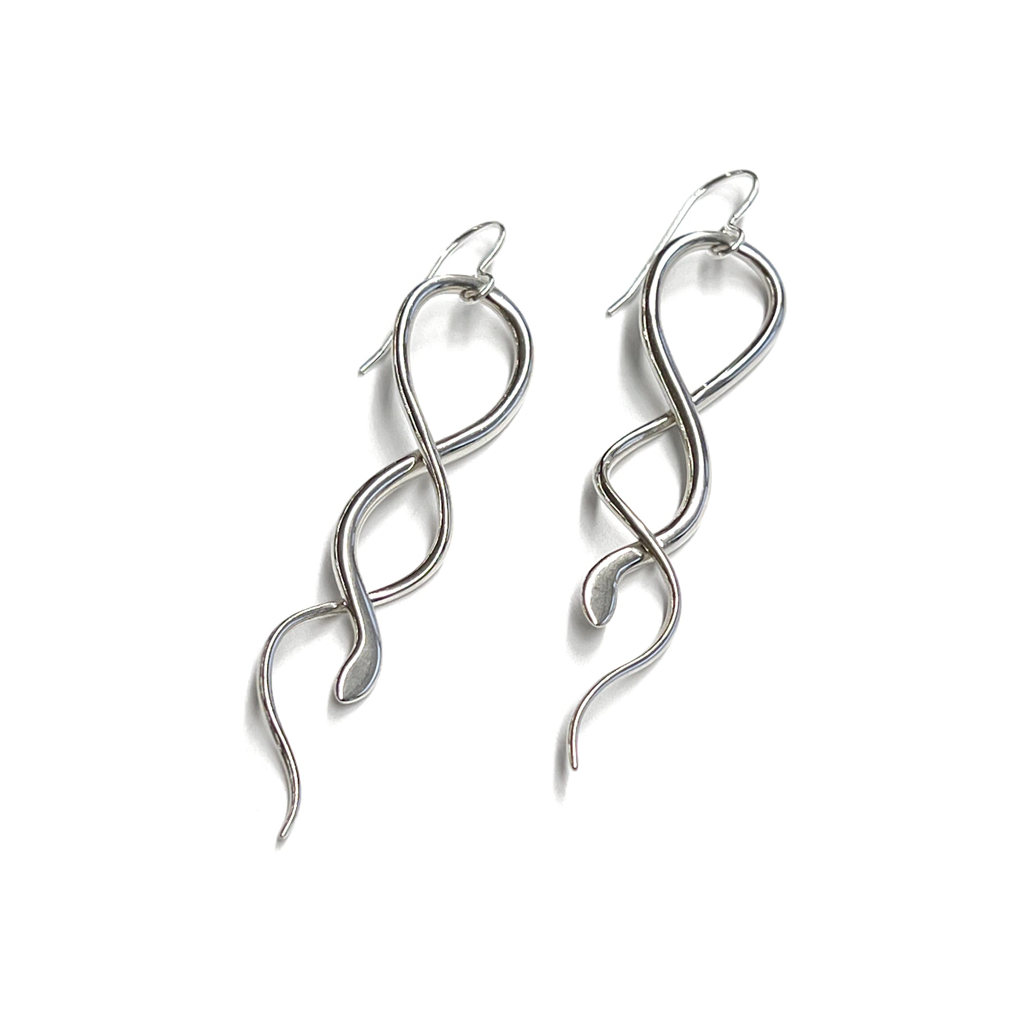 The Python Earrings feature exquisitely draped snake designs with a sleek, smooth polished finish that catches the light beautifully. Crafted from sterling silver, these earrings measure 1/2 inch wide by 2 3/4 inches high, offering a graceful and elongated silhouette that adds effortless sophistication to your look. They hang from sterling silver ear wires, ensuring both comfort and durability for daily wear. Perfect for those who appreciate elegant, nature-inspired jewelry, these earrings provide a statement of subtle strength and refined style.