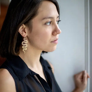 These Boa Earrings offer a bold, graphic serpentine design that adds striking elegance to any outfit. Measuring 1 inch wide by 2 1/2 inches high, they provide a balanced and eye-catching presence without feeling heavy. The earrings are made from brass and hang from 14K gold fill ear wires, ensuring both durability and a comfortable fit for daily wear. Perfect for those seeking a unique accessory with a touch of refined artistry.